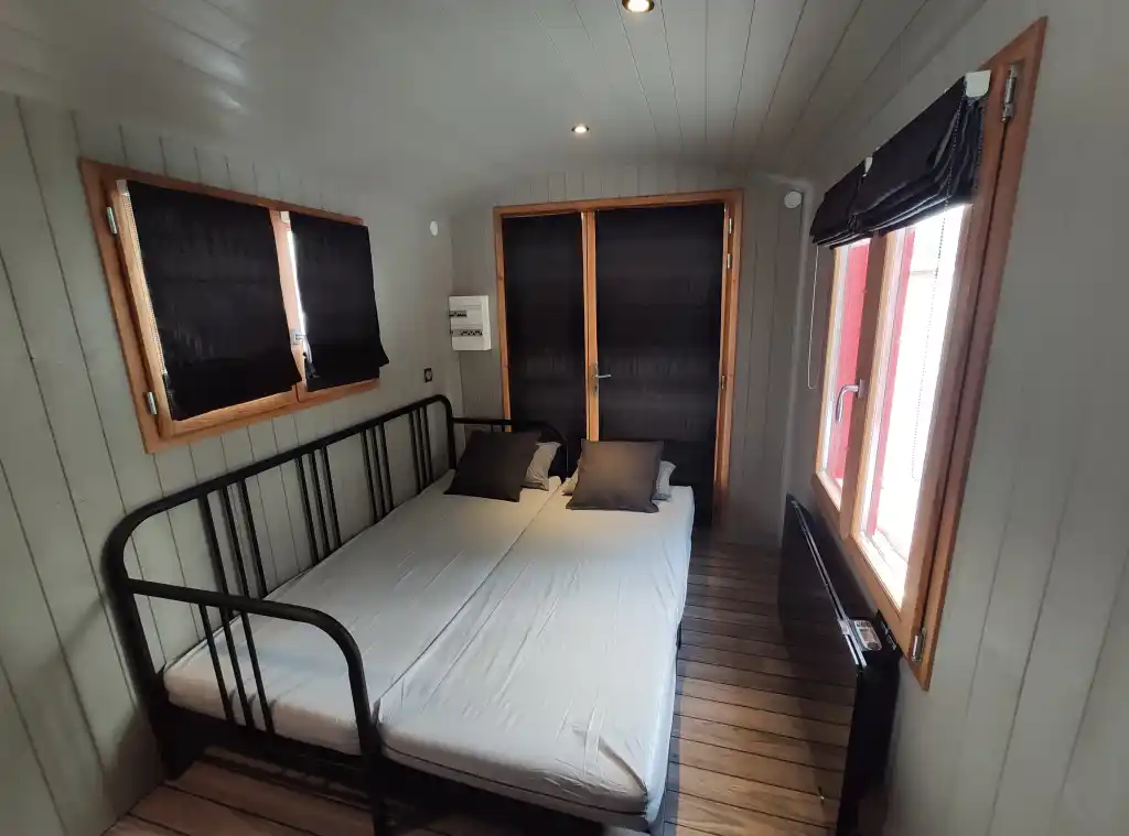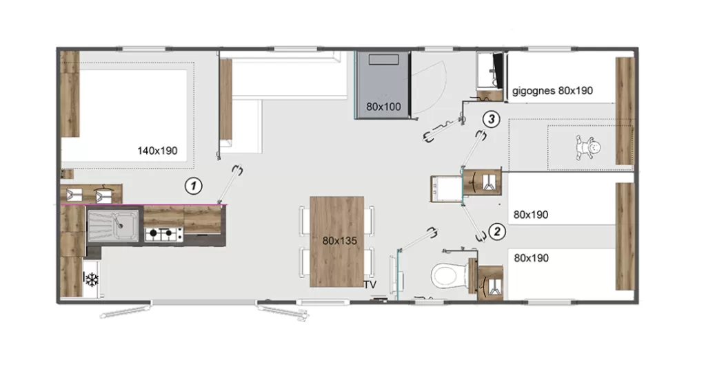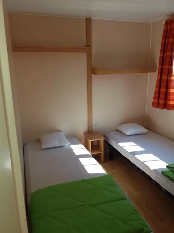 - D’une deuxième chambre avec 2 lits simples (80x190), rangements, couettes, oreillers et alèses.