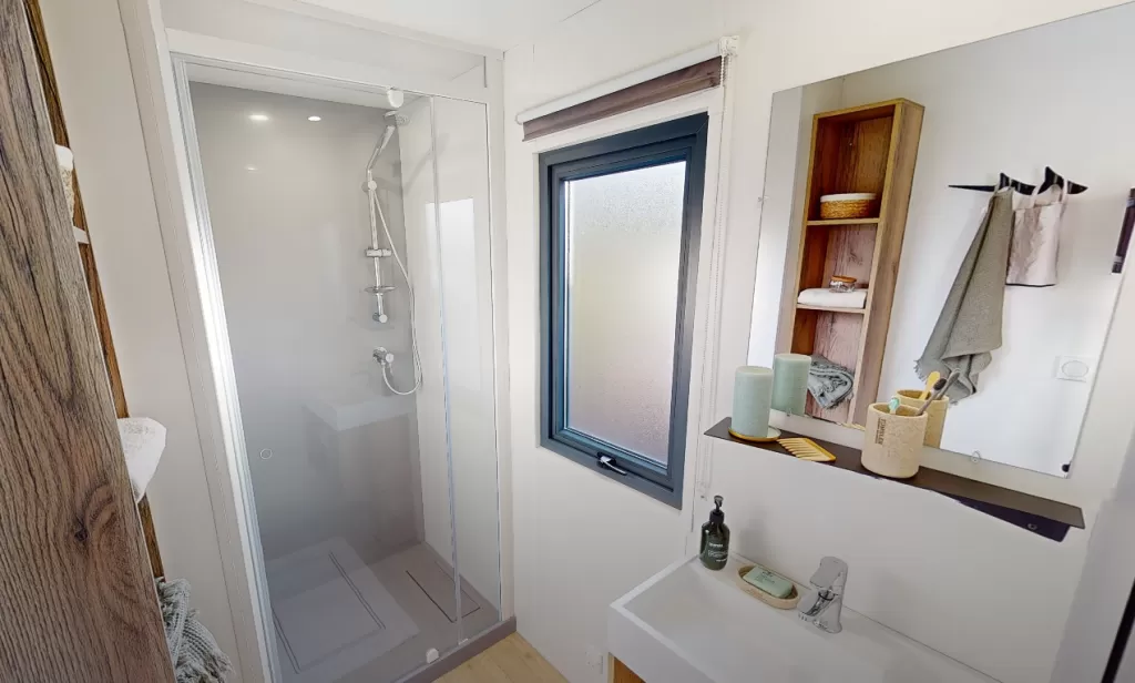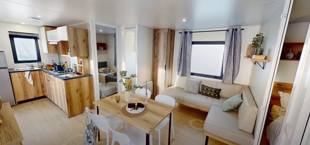 Dans ce Mobil-home tout confort d’une superficie de 32m2, vous pourrez séjourner jusqu’ à 4 personnes.
