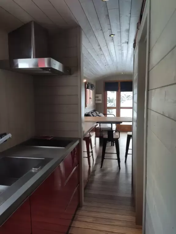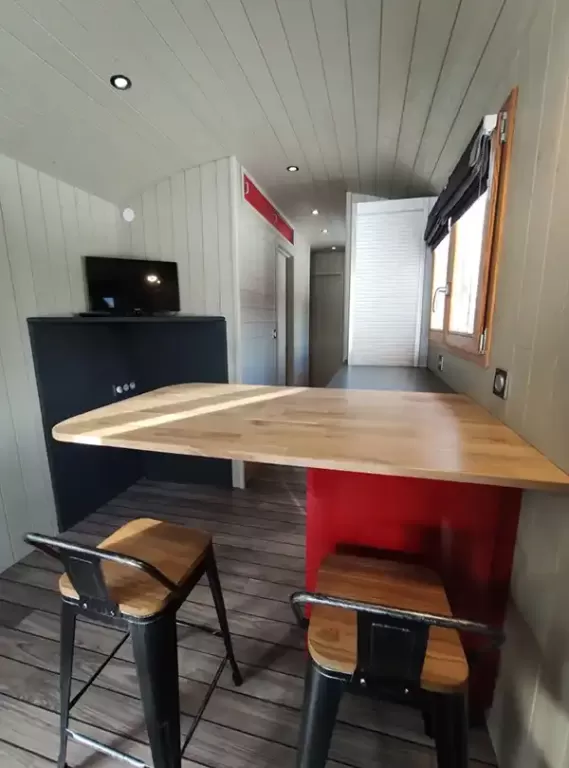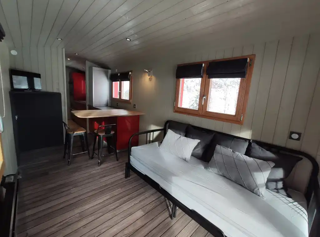 - D’un espace de vie avec coin cuisine (réfrigérateur, micro-onde, gazinière, cafetière électrique, bouilloire, vaisselle et nécessaire ménage) et coin salon avec banquette.